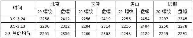 表1:各主导市场2-3月份建材均价